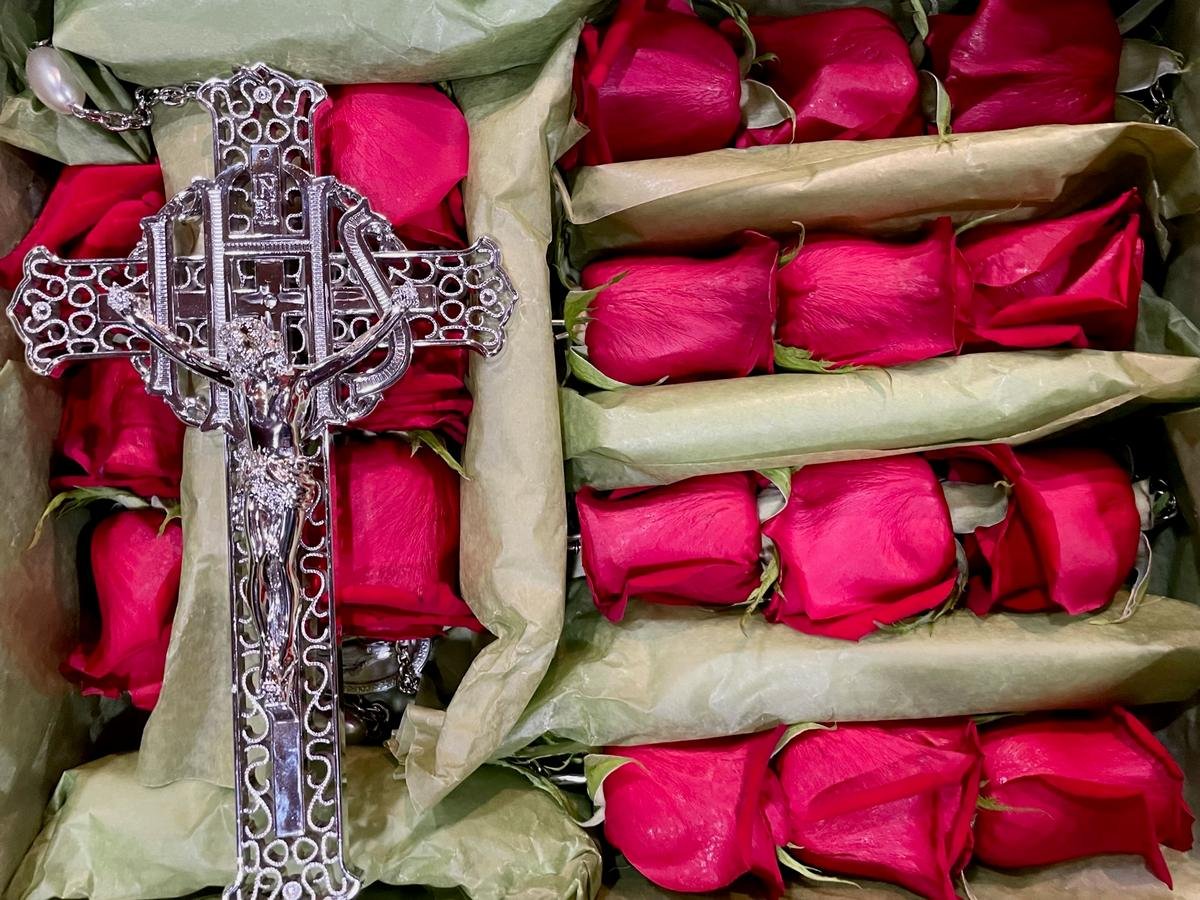 Introducing “The Little Flower,” named after our patron St. Therese of Lisieux, this chaplet of 18 fresh roses is perfectly sized for tabletop display or placement within a casket lid. It’s a delightful gift for birthdays, sacraments, or anytime a special floral surprise is needed.