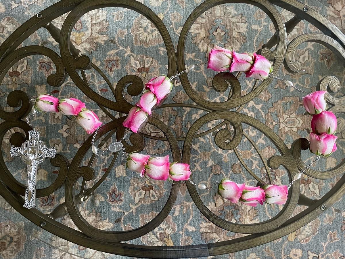 The Little Flower Rosary features 18 fresh roses. 5 feet long*